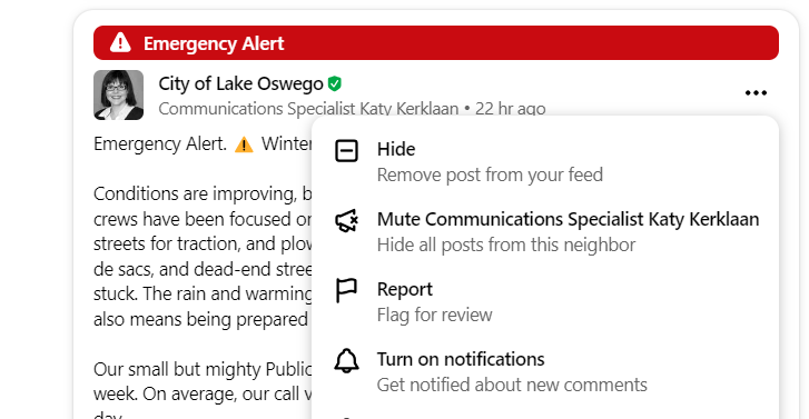 • NextDoor.com Notifications: Turn on notifications from the City Of Lake Oswego via NextDoor.com for up-to-date info from the City of Lake Oswego. During the Jan. 2024 winter storm there were almost daily posts.