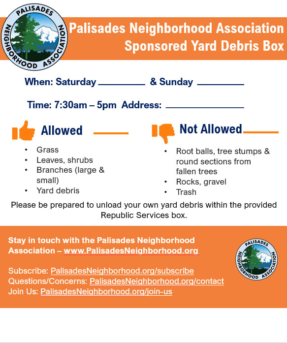 Contact us to request for a free drop box. The Palisades Neighborhood Assoc. (PNA) will submit a request on your behalf. If the City confirms that there are drop boxes available for your chosen weekend, we will notify nearby neighbors via our email subscription list. Not subscribed? Use this subscribe link.