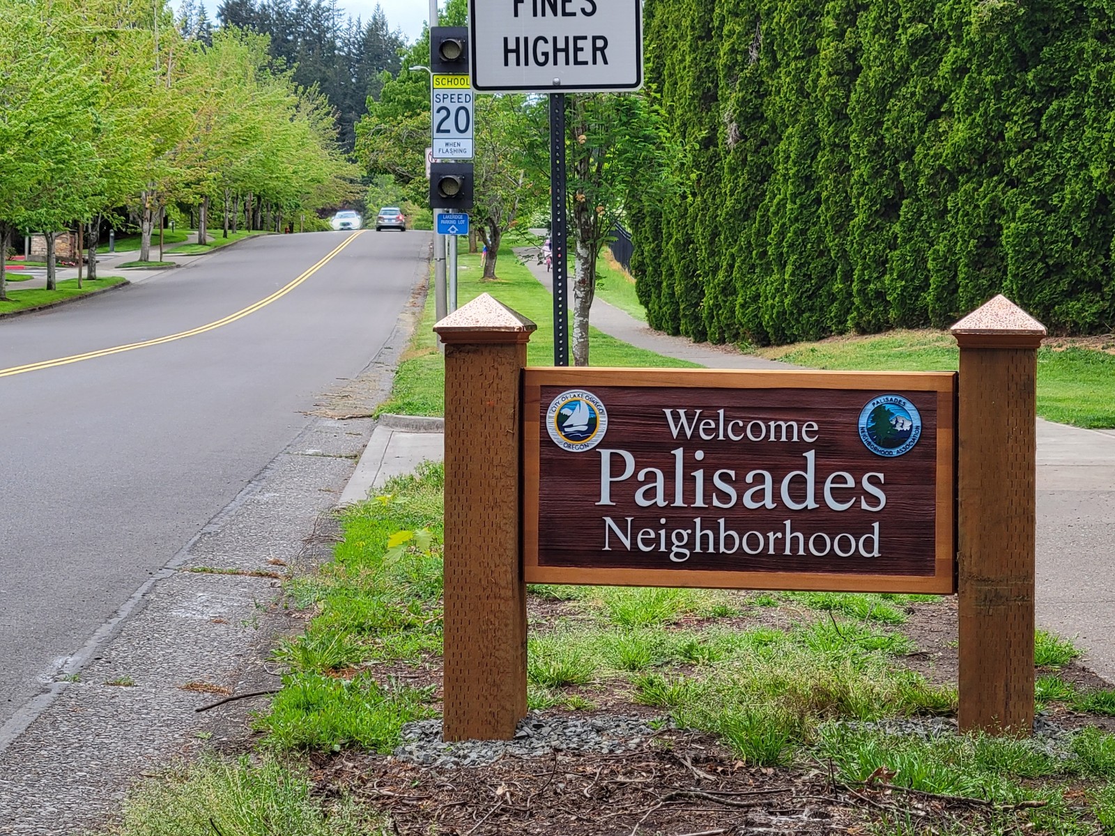 We hope our neighbors have noticed the neighborhood signs on Overlook near Stafford Rd. and at South Shore and Greentree arranged by your Palisades Neighborhood Ass. (PNA). They are designed to help us reinforce a neighborhood identity. We welcome your feedback and your suggestions for other locations.
